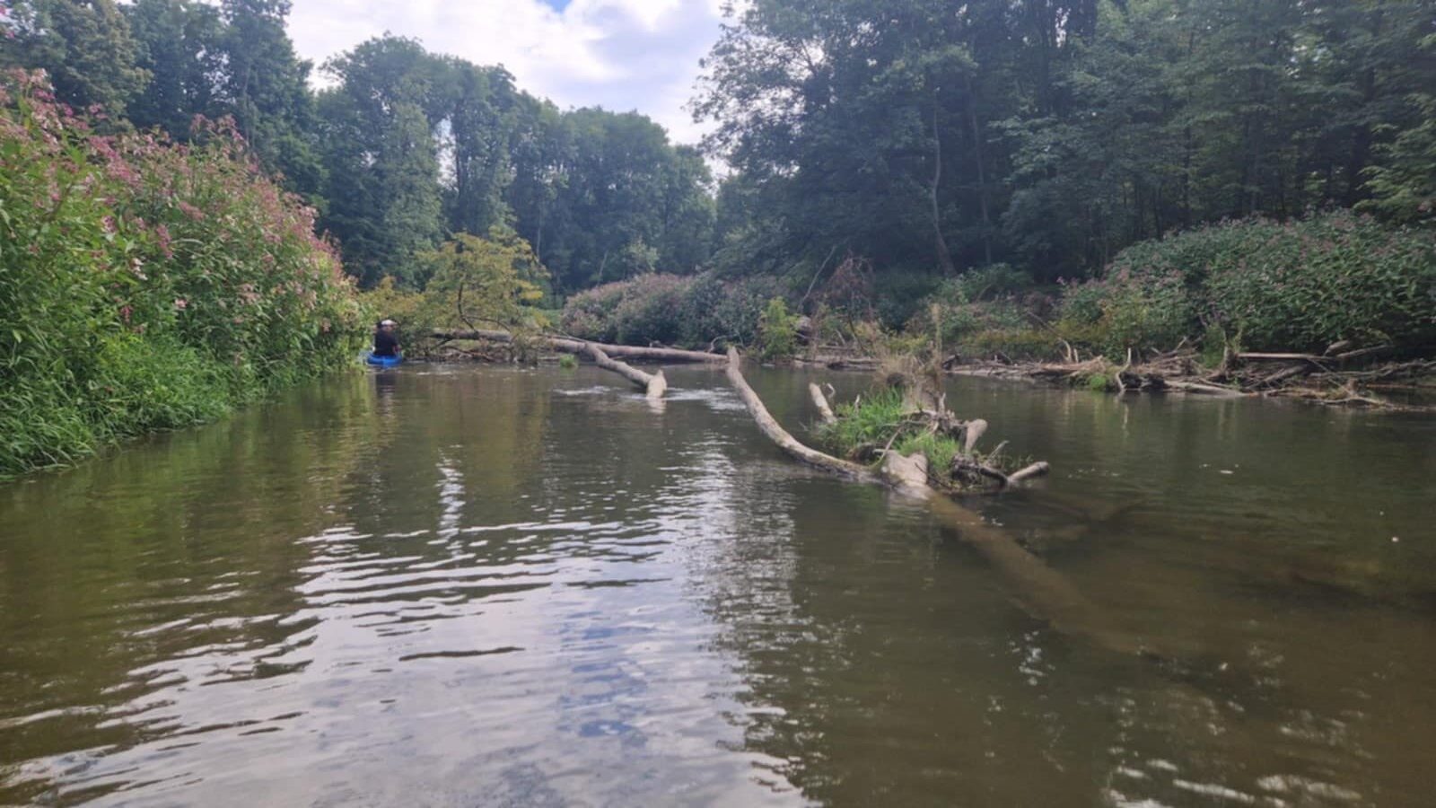 Bylo to krásné — i když občas trochu dobrodružné. Korytem řeky protéká voda mezi popadanými, rozvětvenými stromy. Některé tvoří malé ostrovy a jiné už dávno zarostly zelení, takže z nich vznikly doslova „zahrádky“ uprostřed proudu.